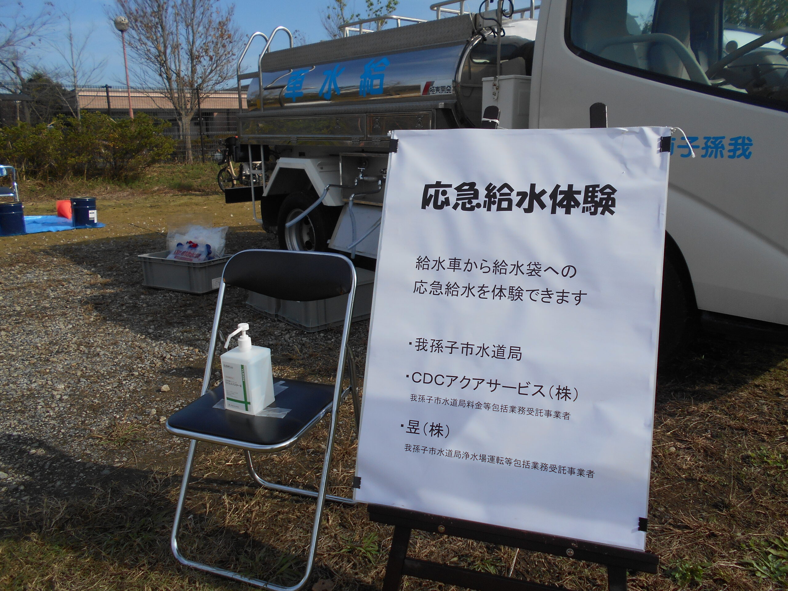 千葉県我孫子市主催の「我孫子市総合防災訓練」が、2024年11月16日(土)に川村学園女子大学グラウンドにて実施されました。地震発生に伴い水道管の断水を想定の内容で、弊社は、給水車による応急給水方法の模擬体験と住民への説明を行いました。