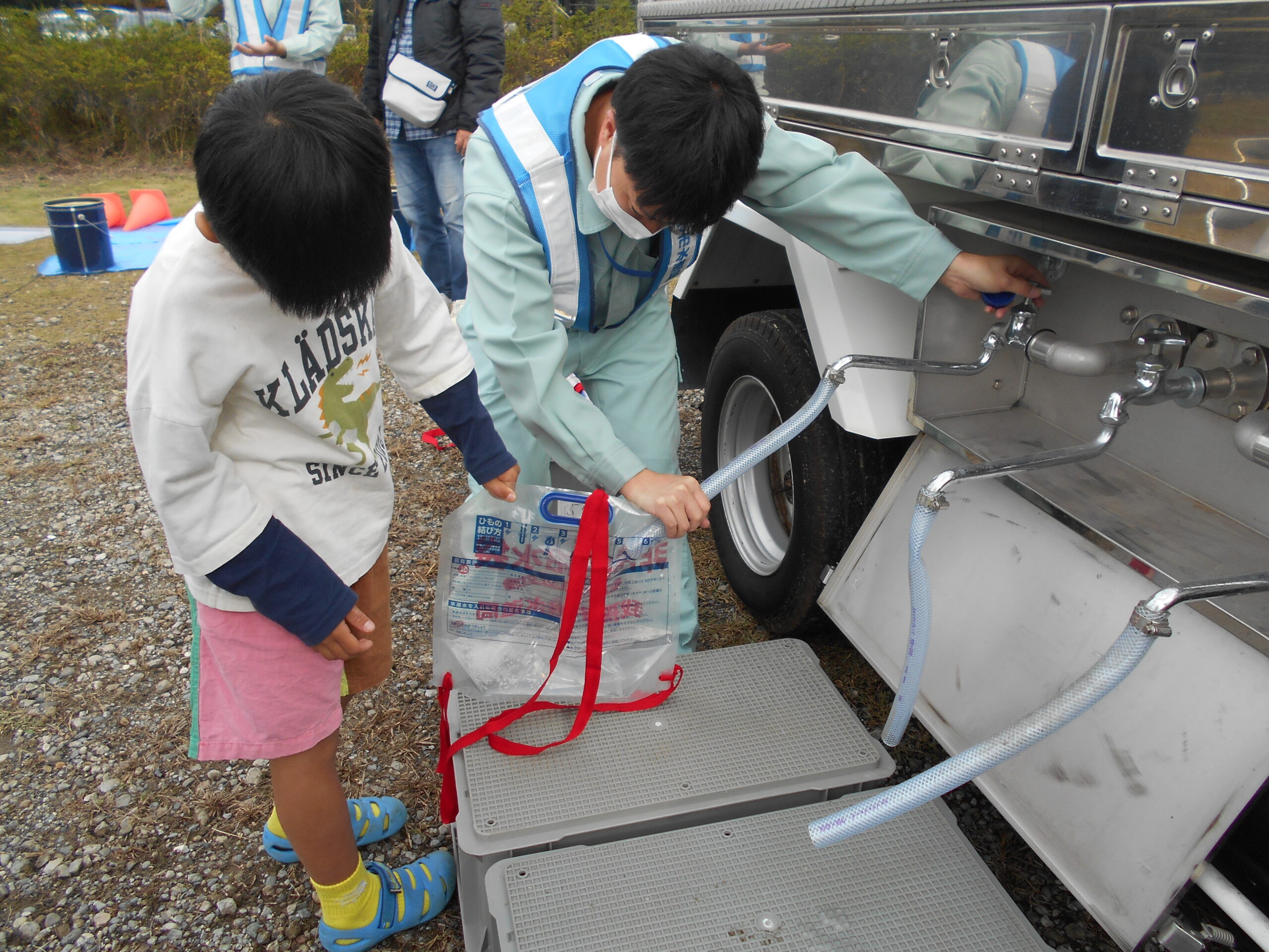 お子様にも給水袋を背負って実際の重さを体験してもらうことで災害時の水の運搬がどれほどの負担になるのかを体現することが出来ました。