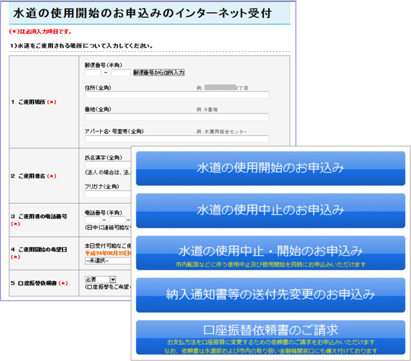 使用開始・使用中止・納入通知書等の送付先変更・口座振替依頼書のご請求の申し込みを、インターネットを利用して行う事ができるシステムです。